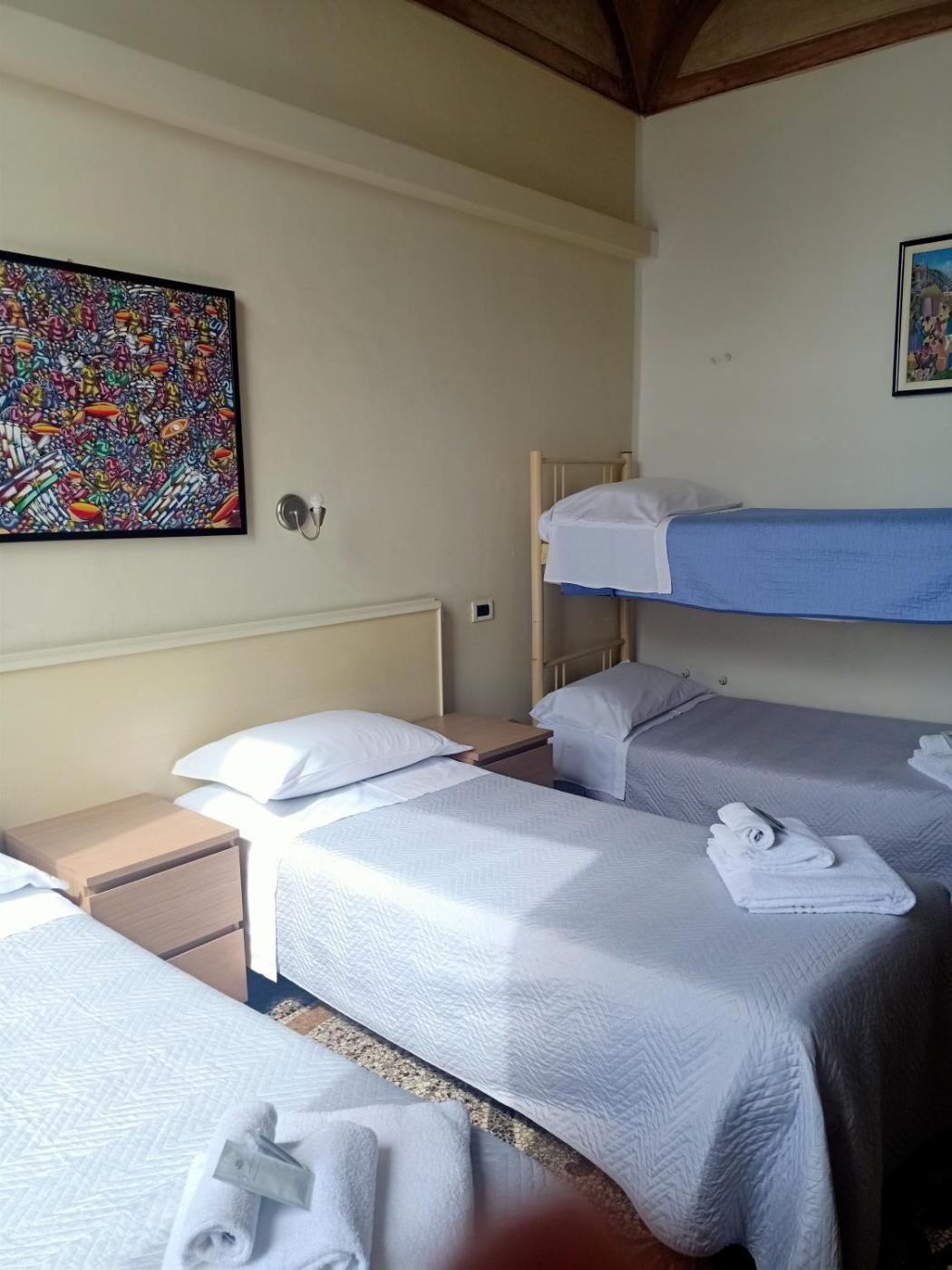Camera Quadrupla Economy. Featuring free toiletries, this quadruple room includes a private bathroom with a shower and a hairdryer. The quadruple room features a private entrance, a wardrobe, a dressing room, a flat-screen TV, as well as city views. The unit has 3 beds. ;