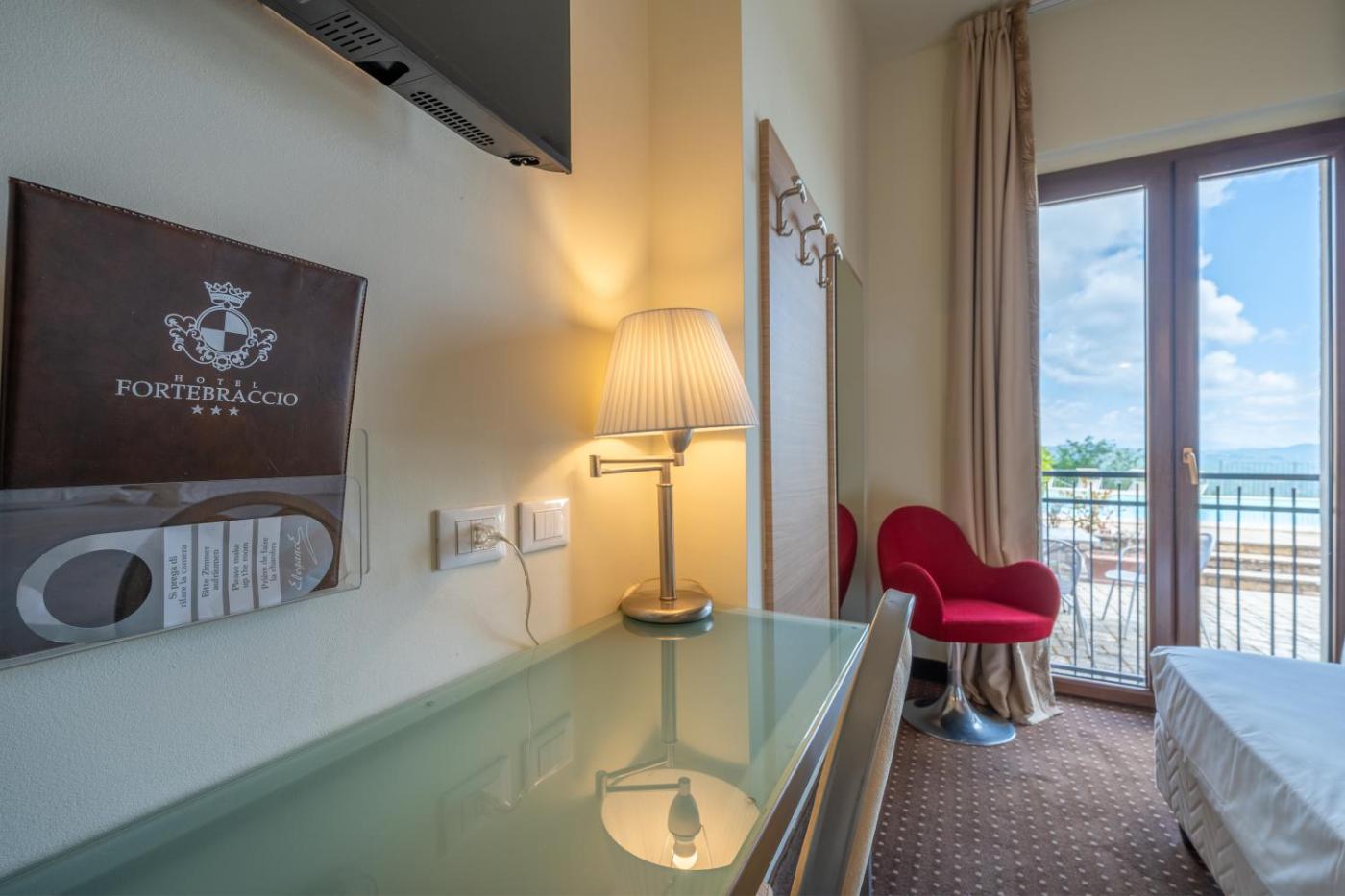 Tutte le luminose camere del Fortebraccio dispongono di bagno interno e TV satellitare. Il WiFi è disponibile gratuitamente in tutto ledificio.